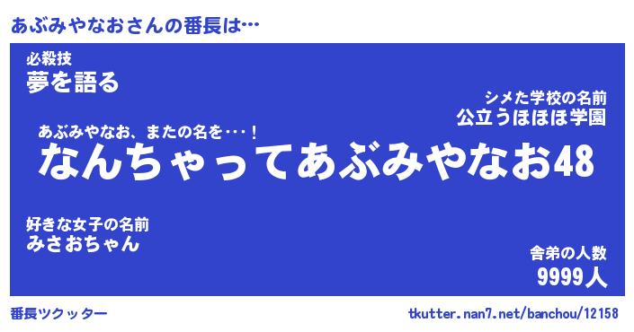 | 男性向けラノベタイトル風あだ名 | 『あぶみやなおの憂鬱』 |