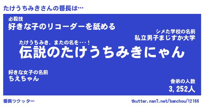| ヘコむあだ名 | 『たけにゅー』『酢こんぶ』『たけを』 |
