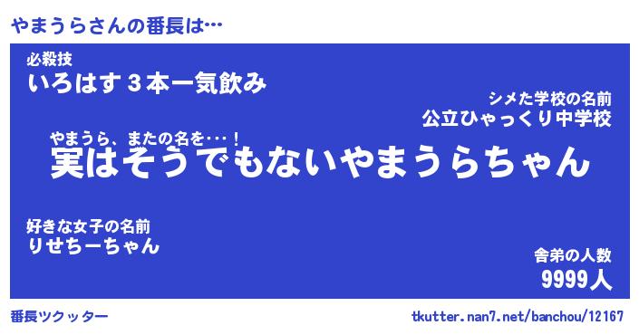 | ヒーロー風カッコイイあだ名 | 『スーパーヤマウラ』『天弓騎士ヤマ』 |