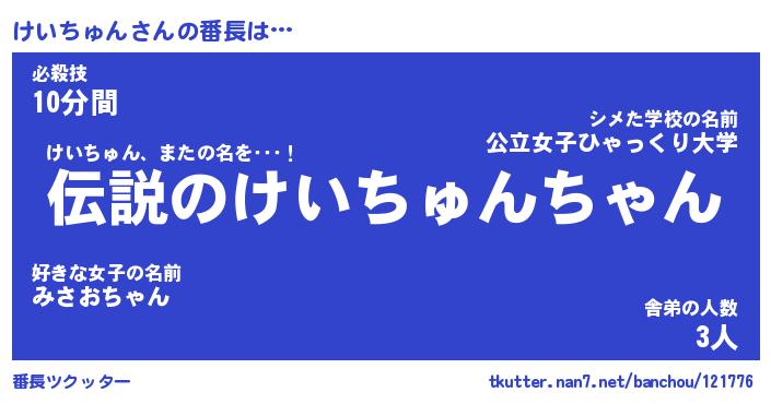 | 伝説のあだ名 | 『伝説のスナイパーけいちゅん』 |