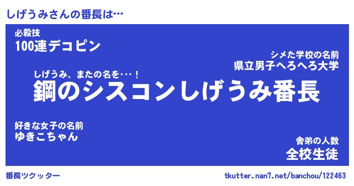 | 肩書あだ名 | 『しげうみ店長』『しげうみ国家主席』 |