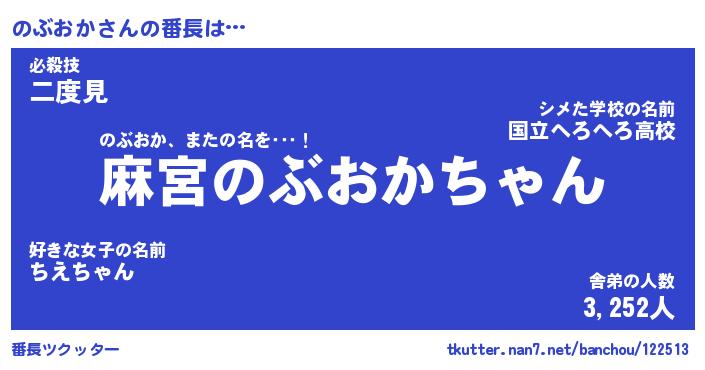 | 意味不明あだ名 | 『ペロリンのぶおか』『永久保存のぶおか』 |