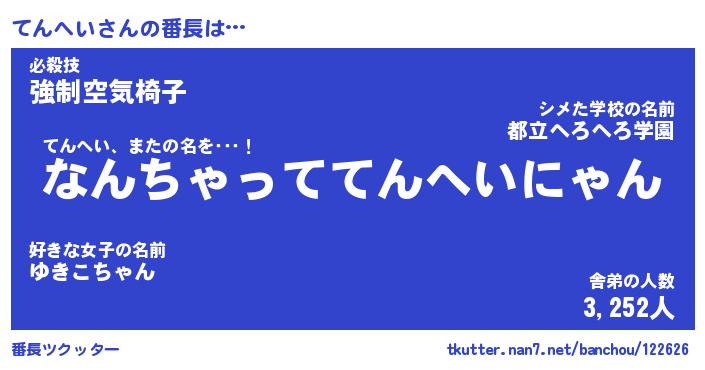 | 意味不明あだ名 | 『ペロリンてんへい』『永久保存てんへい』 |
