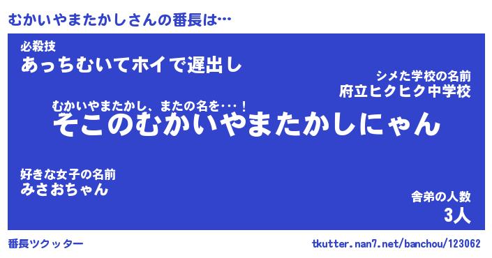 | 肩書あだ名 | 『むかいやまたかし御曹司』 |