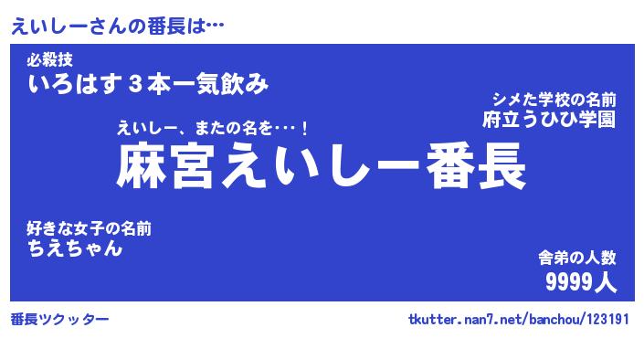 | 意味不明あだ名 | 『ペロリンえいしー』『永久保存えいしー』 |