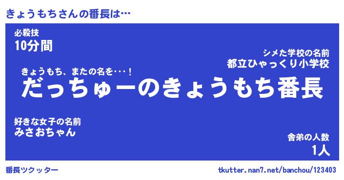 | 男性向けラノベタイトル風あだ名 | 『きょうもちの憂鬱』 |