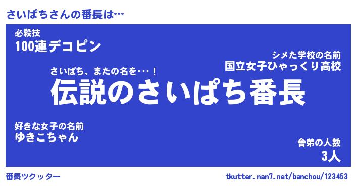 | 意味不明あだ名 | 『ペロリンさいぱち』『永久保存さいぱち』 |