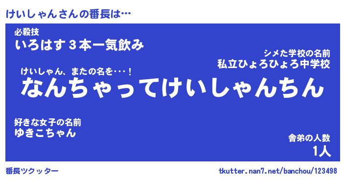 | 伝説のあだ名 | 『伝説のスナイパーけいしゃん』 |
