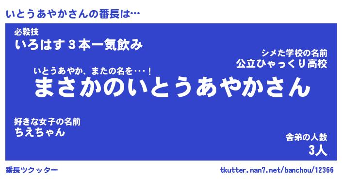 | ヘコむあだ名 | 『いとにー』『なまこ酢』『いと太郎』 |