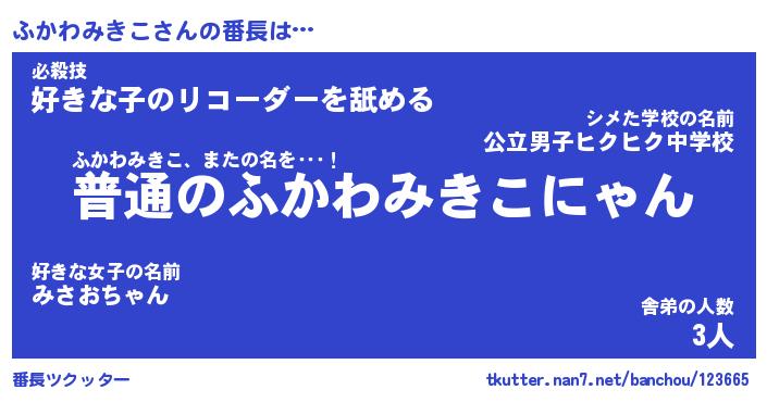| ヒーロー風カッコイイあだ名 | 『スーパーフカワミキコ』『魔戒騎士フカ』 |