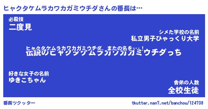 | 女子向けラノベタイトル風あだ名 | 『(仮)ヒャクタケムラカワカガミウチダのやんごとなき事情』 |