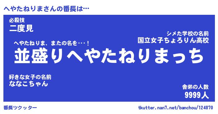 | ヒーロー風カッコイイあだ名 | 『スーパーヘヤタネリマ』『暗黒騎士ヘヤ』 |