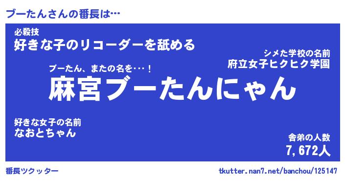 | 意味不明あだ名 | 『ペロリンブーたん』『永久保存ブーたん』 |
