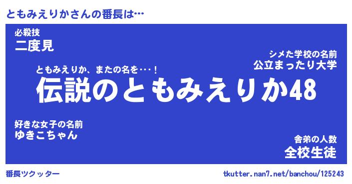 | 恥ずかしいあだ名 | 『プリティーともみえりか』『ともっちょ』 |