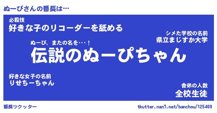 | 伝説のあだ名 | 『伝説のスナイパーぬーぴ』 |