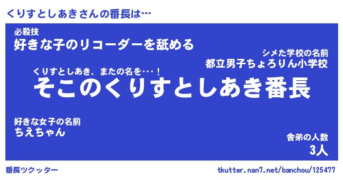 | 伝説のあだ名 | 『不死鳥のスナイパーくりすとしあき』 |