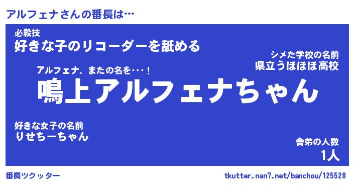 | 肩書あだ名 | 『アルフェナ社長』『アルフェナ総理大臣』 |
