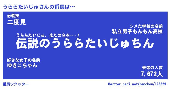 | 伝説のあだ名 | 『伝説のスナイパーうららたいじゅ』 |
