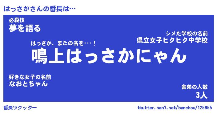 | 意味不明あだ名 | 『ペロリンはっさか』『永久保存はっさか』 |