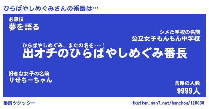 | 伝説のあだ名 | 『伝説のスナイパーひらばやしめぐみ』 |