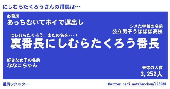| ヒーロー風カッコイイあだ名 | 『スーパーニシムラタクロウ』 |