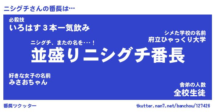 | 肩書あだ名 | 『ニシグチ社長』『ニシグチ国家主席』 |