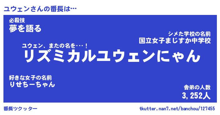 | 意味不明あだ名 | 『ペロリンユウェン』『永久保存ユウェン』 |