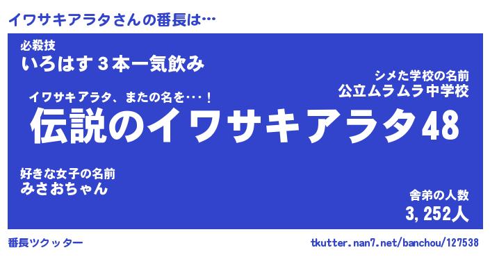| 伝説のあだ名 | 『伝説のスナイパーイワサキアラタ』 |