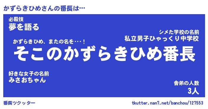 | ヒーロー風カッコイイあだ名 | 『スーパーカズラキヒメ』『魔戒騎士カズ』 |