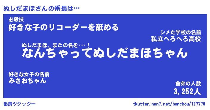 | 肩書あだ名 | 『ぬしだまほ社長』『ぬしだまほ総理大臣』 |