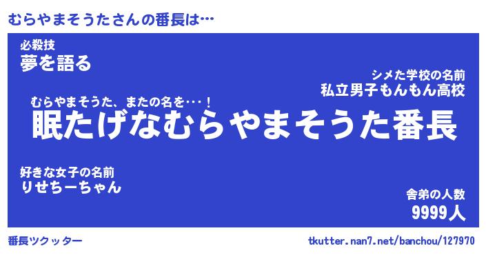 | 男性向けラノベタイトル風あだ名 | 『ムラヤマソウタアートオンライン』 |