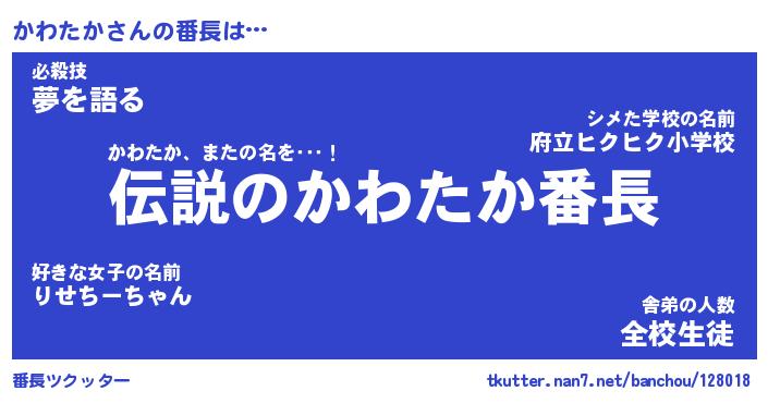 | ファンタジー風あだ名 | 『カワフェル』『エターナルカワタカー』 |