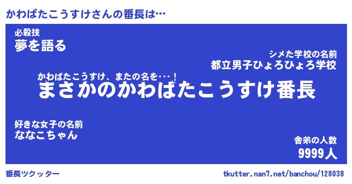 | ヒーロー風カッコイイあだ名 | 『スーパーカワバタコウスケ』 |