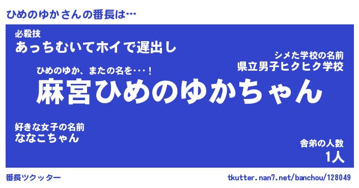 | 伝説のあだ名 | 『不死鳥のスナイパーひめのゆか』 |