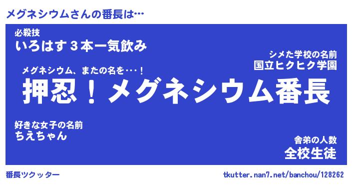 | 肩書あだ名 | 『メグネシウム御曹司』 |