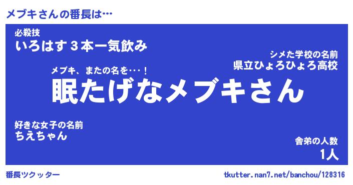 | ヒーロー風カッコイイあだ名 | 『スーパーメブキ』『ウルトラメブキマン』 |