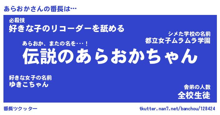 | 意味不明あだ名 | 『ペロリンあらおか』『永久保存あらおか』 |