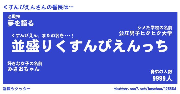 | 男性向けラノベタイトル風あだ名 | 『くすんぴえんの憂鬱』 |