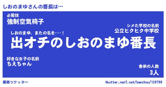 | 肩書あだ名 | 『しおのまゆCEO』『しおのまゆ国家主席』 |