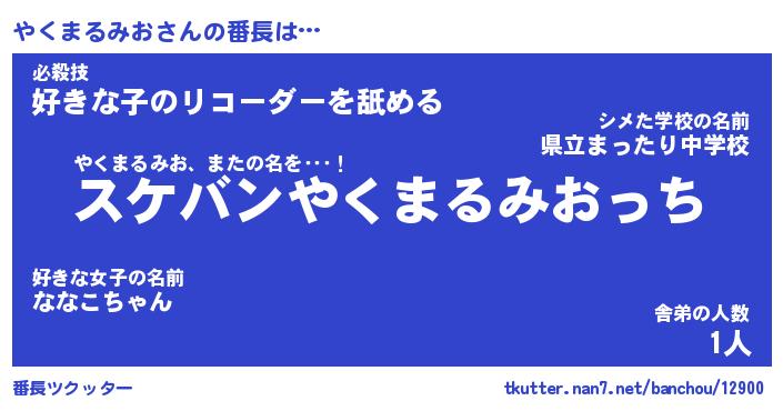 | 肩書あだ名 | 『やくまるみお社長』『やくまるみお班長』 |