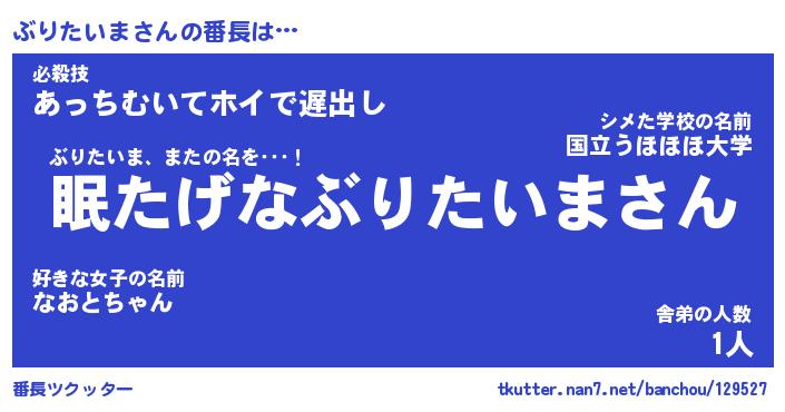 | 肩書あだ名 | 『ぶりたいま御曹司』『ぶりたいま班長』 |
