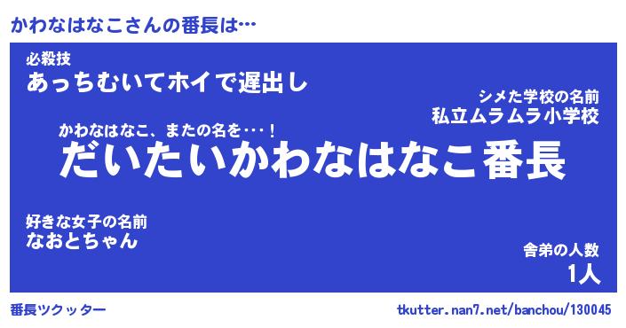 | ヒーロー風カッコイイあだ名 | 『スーパーカワナハナコ』『黄金騎士カワ』 |