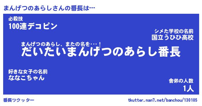 | 伝説のあだ名 | 『不死鳥のスナイパーまんげつのあらし』 |