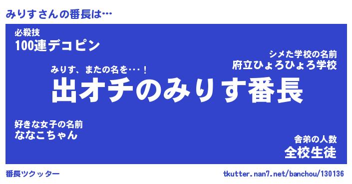 | ヘコむあだ名 | 『みりにー』『つくし』『みりお』 |