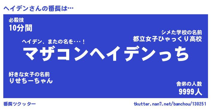 | 肩書あだ名 | 『ヘイデン店長』『ヘイデン総理大臣』 |