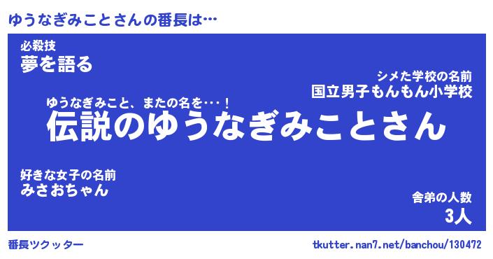 | 伝説のあだ名 | 『伝説のスナイパーゆうなぎみこと』 |