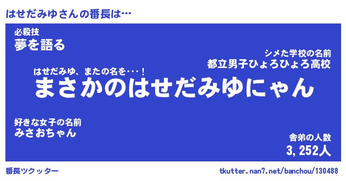 | 肩書あだ名 | 『はせだみゆ店長』『はせだみゆ国家主席』 |