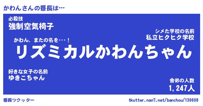 | 意味不明あだ名 | 『ペロリンかわん』『かわんフォーエバー』 |