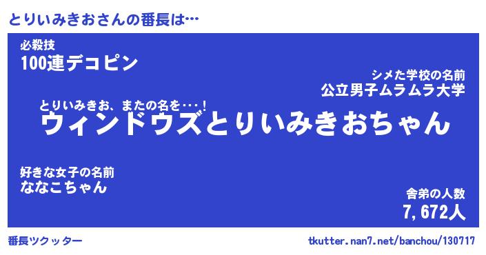| 肩書あだ名 | 『とりいみきお店長』『とりいみきお担任』 |