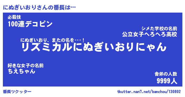 | ヒーロー風カッコイイあだ名 | 『スーパーニヌギイオリ』『黄金騎士ニヌ』 |